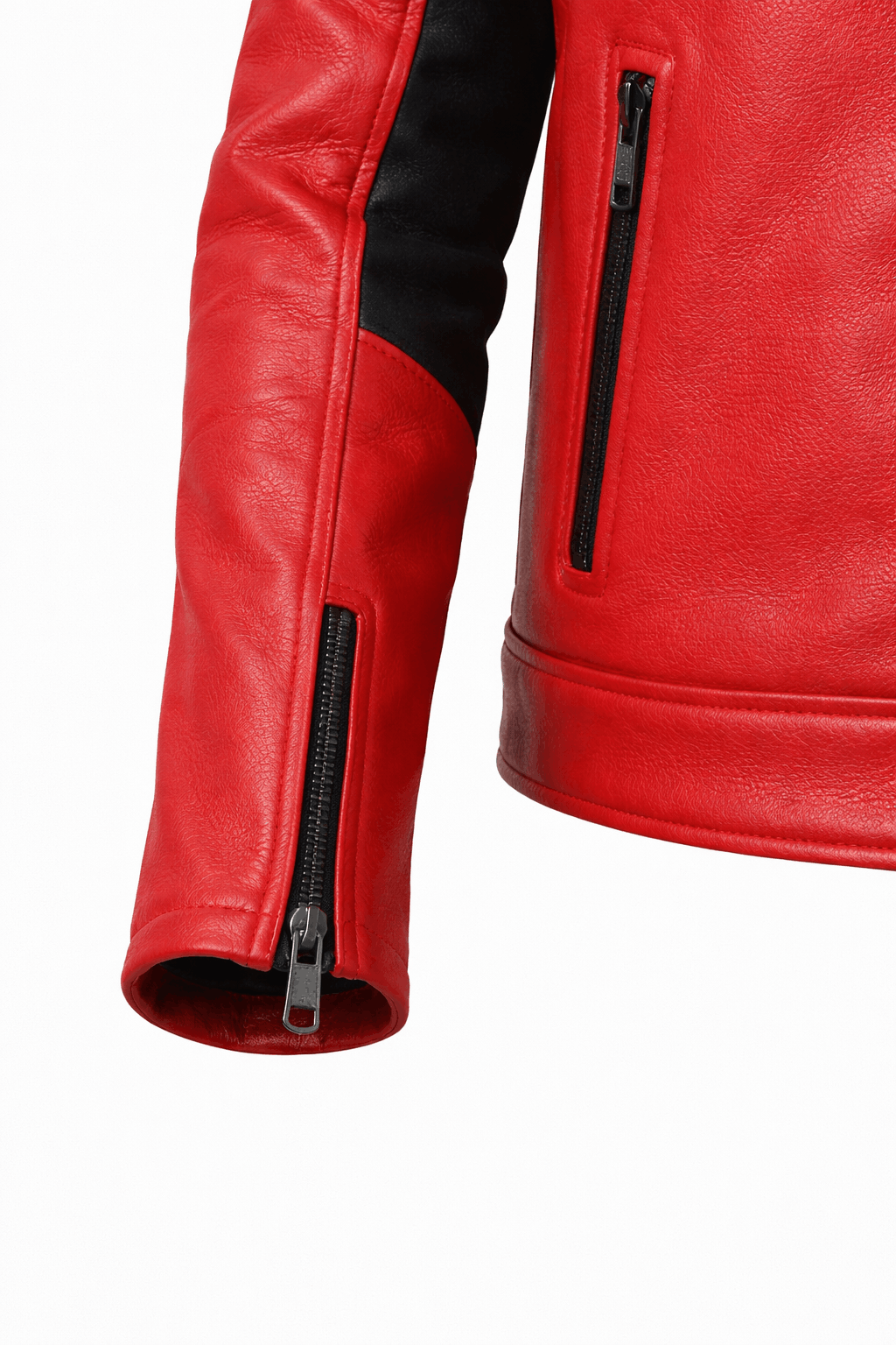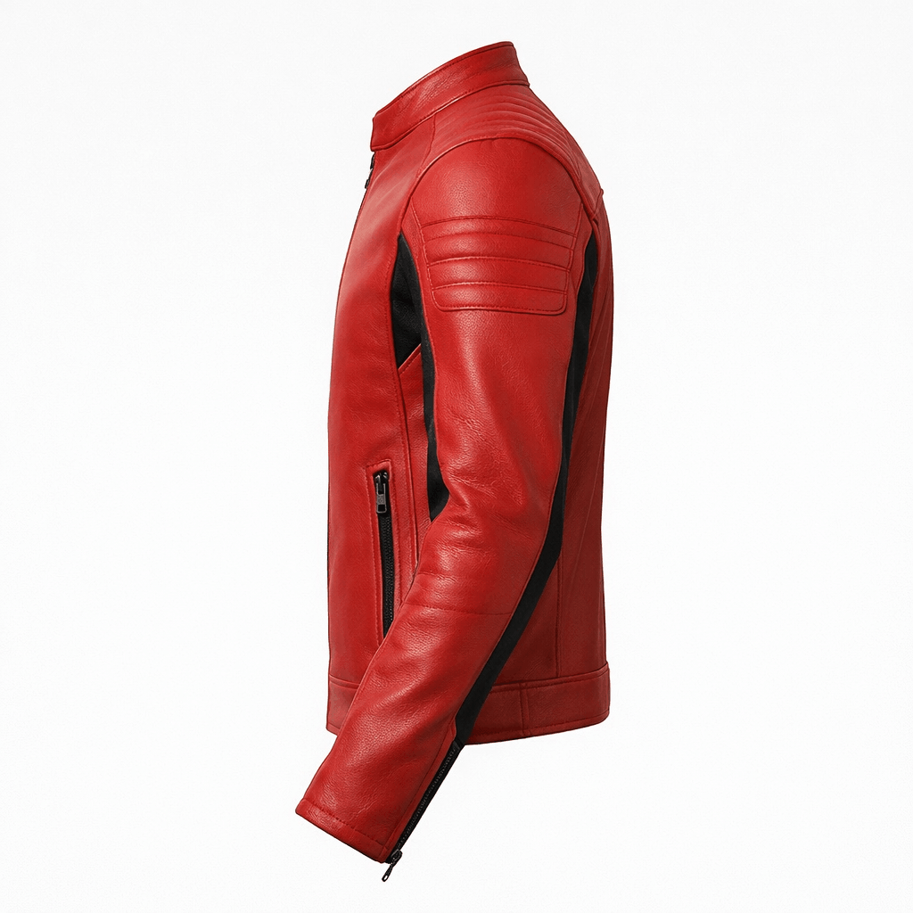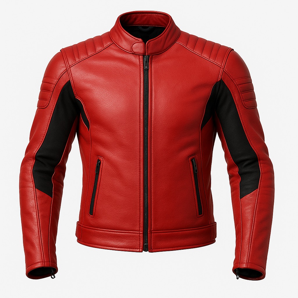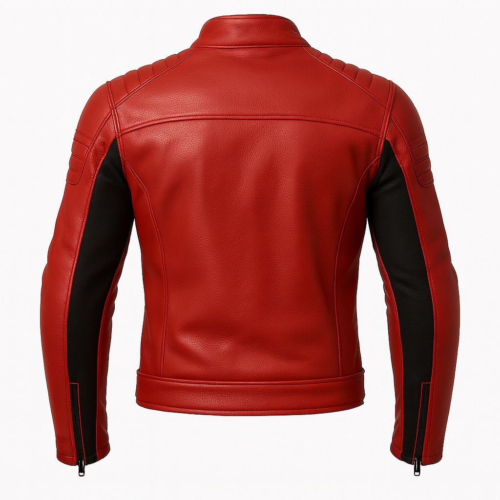 This premium red and black racing-style leather jacket is designed for modern fashion brands and international wholesale buyers seeking a bold, high-performance biker look. The vibrant red body combined with black contrast sleeve panels enhances the aggressive racing aesthetic.