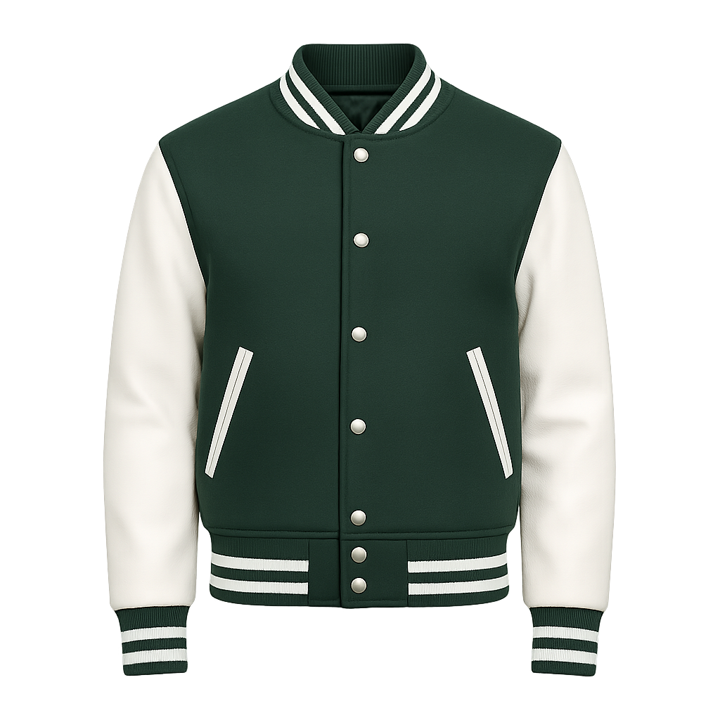Upgrade your outerwear collection with this classic green and white varsity bomber jacket. Designed with a structured wool-look green body, contrasting white sleeves, striped rib-knit collar, cuffs, and hem, and secure snap-button front closure. Features angled side pockets and a comfortable relaxed fit for everyday wear. Ideal for streetwear, teamwear, casual outings, and seasonal layering. Durable stitching, clean finishing, and timeless athletic-inspired styling make it a standout wardrobe staple.