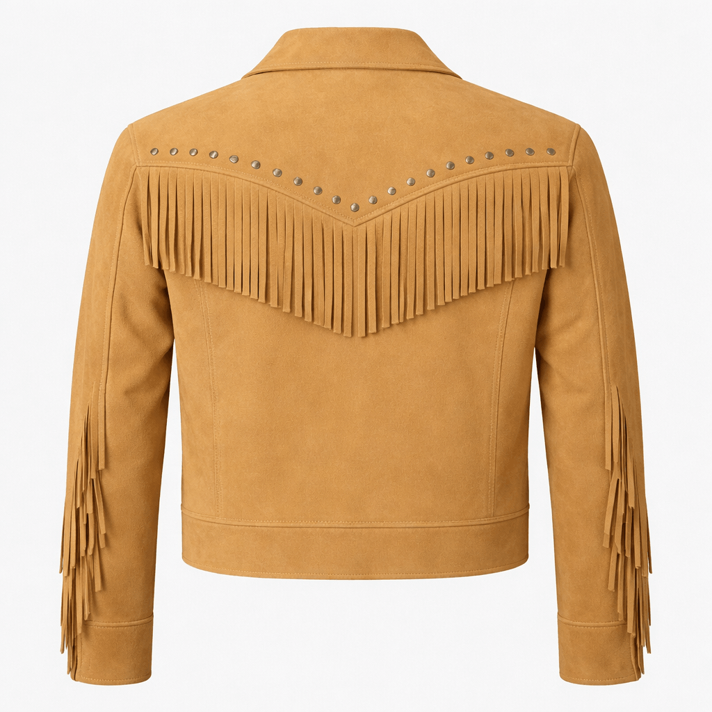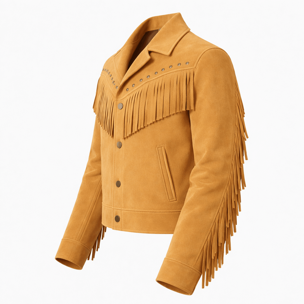 This menβs western-inspired leather jacket is crafted with stylish front fringe detailing and metal stud accents across the chest, delivering a bold cowboy aesthetic. The structured fit and clean tailoring maintain a modern silhouette while preserving authentic western character.