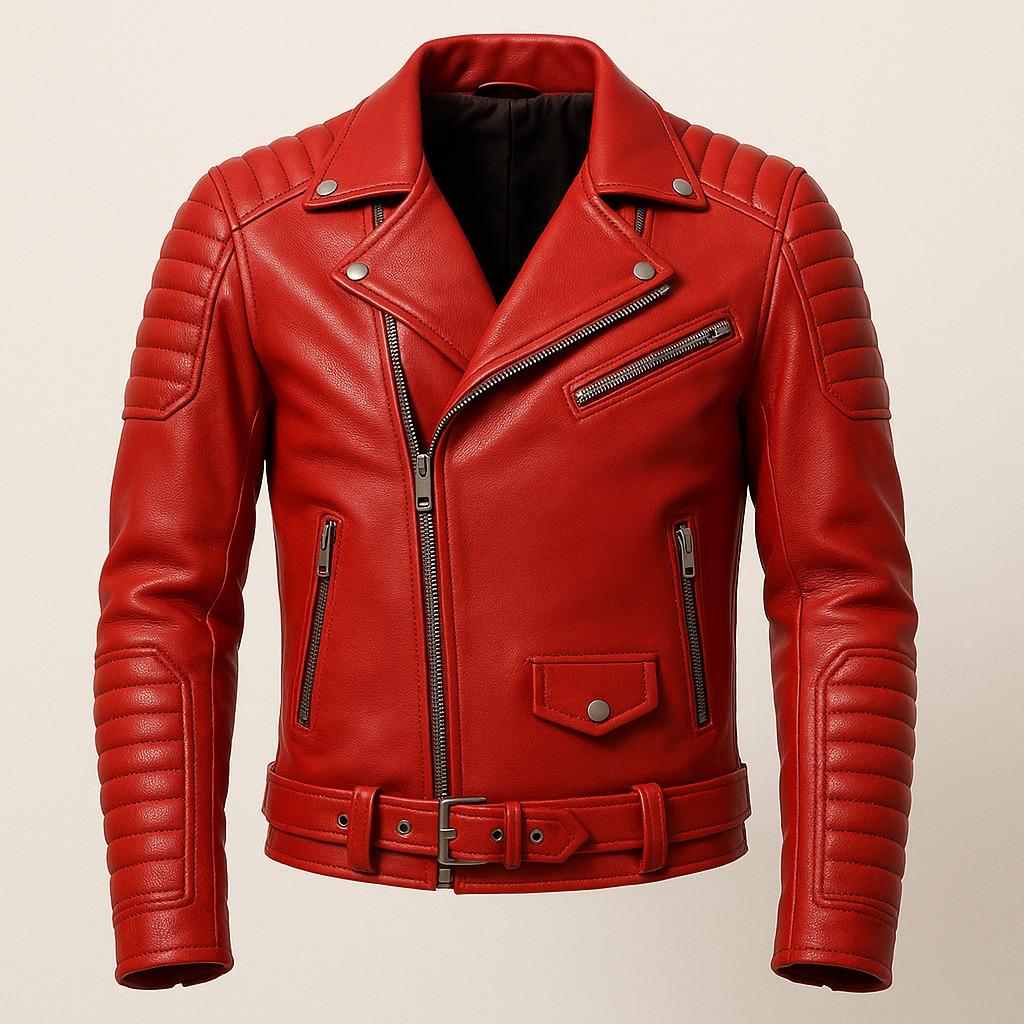 Turn heads with this men’s red biker leather jacket, designed for those who prefer bold and confident outerwear. Crafted from premium-quality leather, this jacket features a classic asymmetrical front zip closure, quilted padding on the shoulders and sleeves, and a structured biker silhouette.