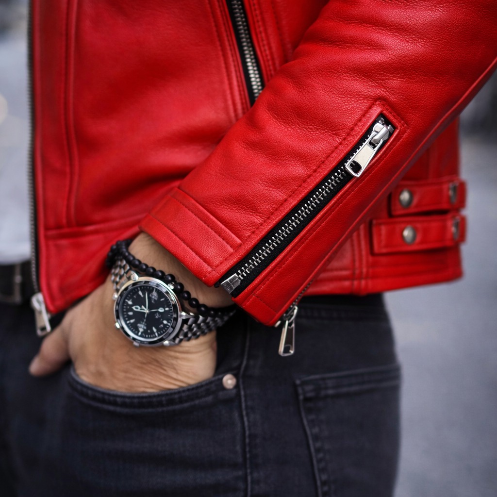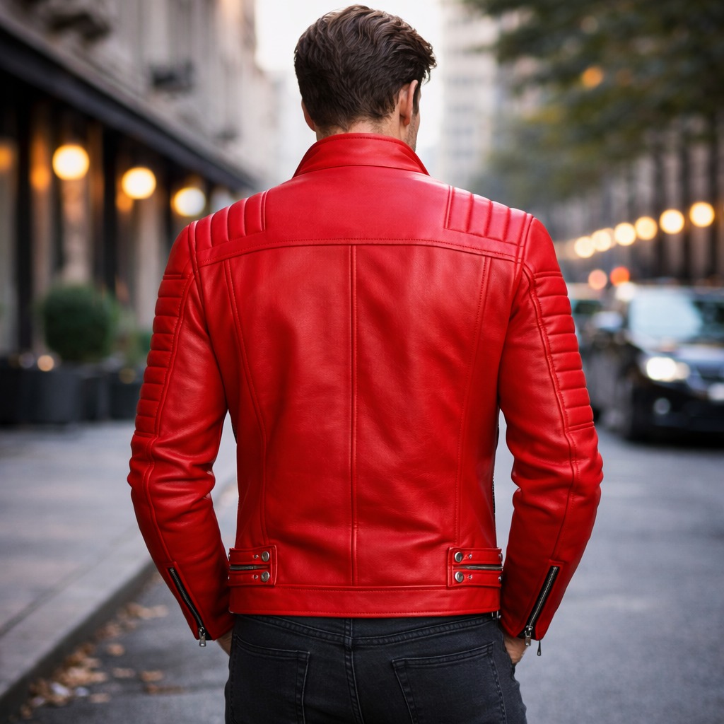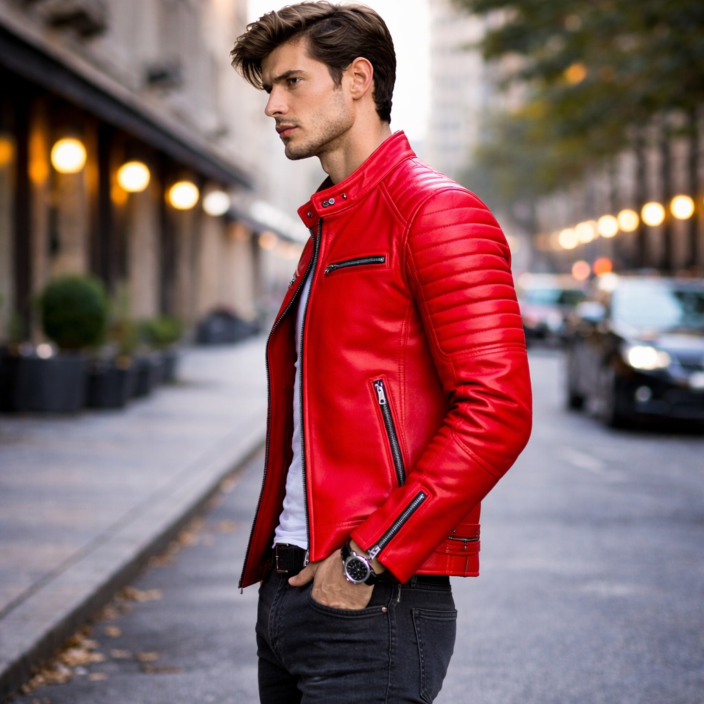 This premium men’s red biker leather jacket is designed for fashion-forward brands and international wholesale buyers seeking a bold racing-inspired look. The vibrant red leather combined with quilted sleeve detailing and structured silhouette delivers a strong, modern biker aesthetic.