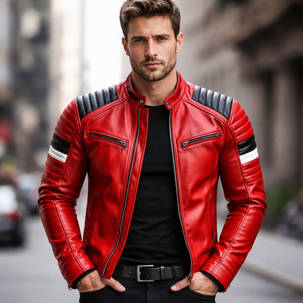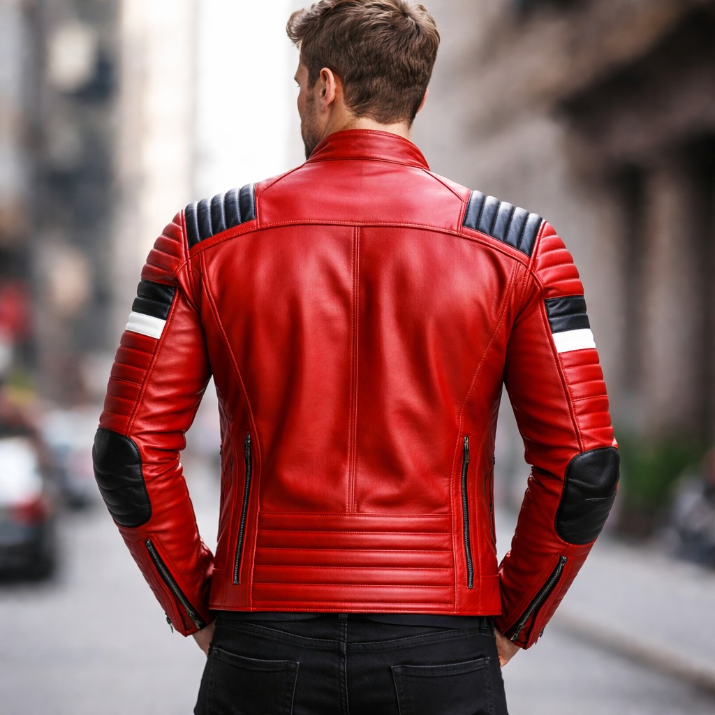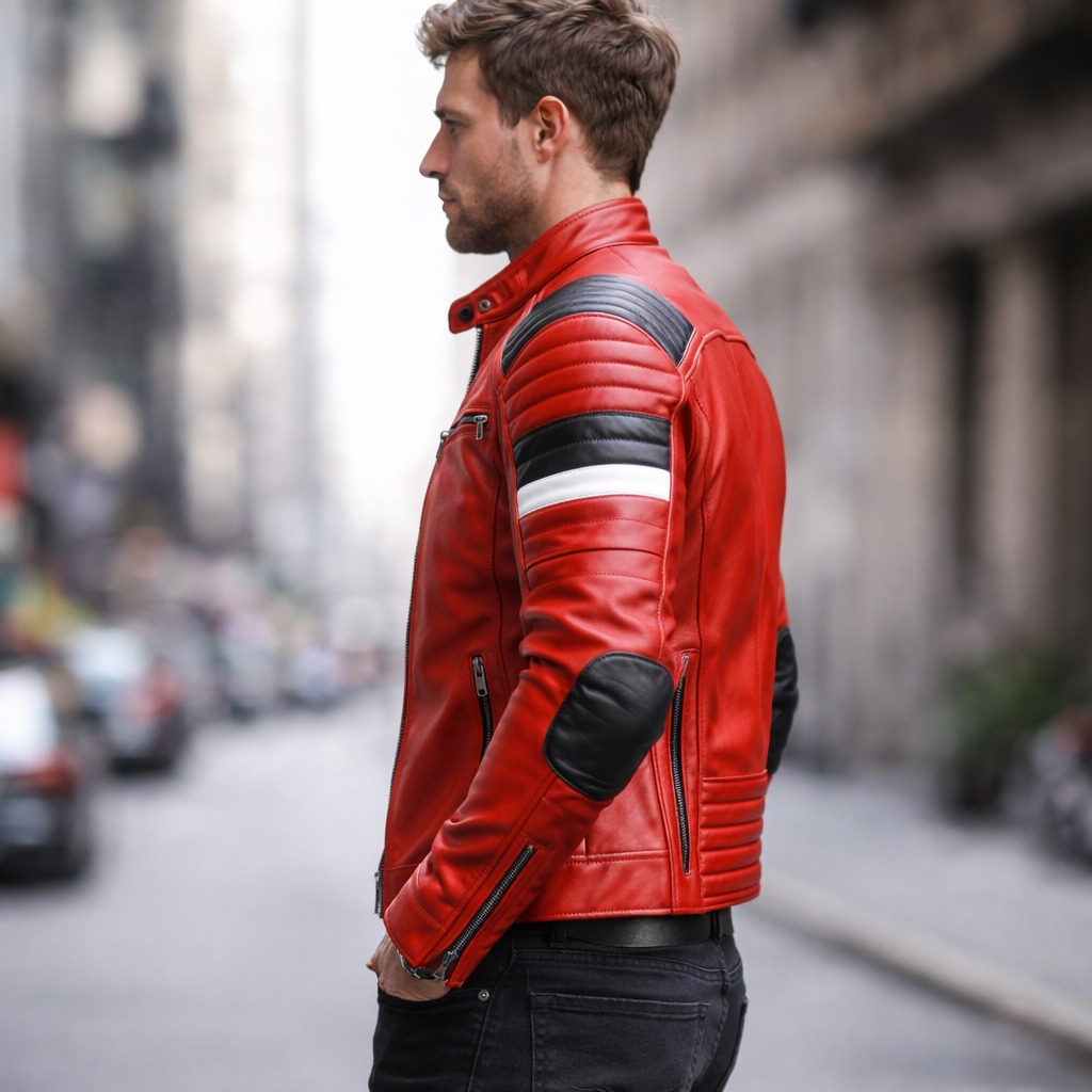 This premium red racing leather jacket is designed for modern fashion brands and international wholesale buyers seeking bold styling and superior craftsmanship. The vibrant red base combined with black padded shoulder panels and white stripe detailing creates a strong racing-inspired look.